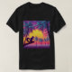 A vibrant purple squirrel balances on a palm trunk, overlooking rows of bright teal palms and a glowing yellow sun. The pink and orange sky and cyan grid sea give this illustration a playful 80s arcade energy. Perfect for animal lovers and fans of bold, colorful synthwave artwork.