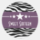 Trendy and modern Stars Zebra Print Sweet Sixteen Stickers featuring a chic black and white zebra print background and a bold purple border adorned with a fun star motif. These girly stickers are a hip and stylish choice for a fun sweet 16. Easy to customise, simply add party details in the text fields provided. Click "Customise It" to find more personalisation options.