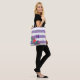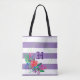 complete your signature collection with this pastel purple broad striped floral background tote bag. initial enclosed in geometric border with colourful water colour floral bunch. hit personalise button to add your initial or your text.