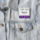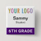 Our square student name button is easily personalizable with your school logo, student name, or other custom text. It attaches with a safety pin back. This affordable name tag is ideal for students (age 10 and up) on field trips, in classrooms, and other situations where quick identification of students is necessary. Designed in purple and other colors (all colors are customizable). Our square buttons are 2 inch x 2 inch. Made in USA. No minimum order quantity and no setup fee.