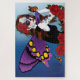 Day of the dead sugar skull fairy with purple wings and red roses all around in a backdrop of blue and monarch butterflies.