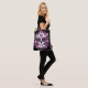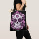 Dia de los Muertos sugar skull in colorful hues of purple surrounded by flowers.