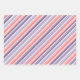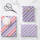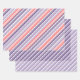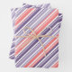 A classic candy cane stripe wrapping paper featuring a muted coral pink stripe, a mulberry blue purple stripe and lavender mauve purple stripe mix with white candy cane stripe pattern.