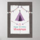 A birthday poster featuring an illustration of a purple chevron tipi, bunting, and arrows. Background is wood inspired. Matching birthday party invitations, stickers, and more are available at Jill's Paperie.