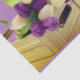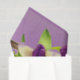 Tissue paper with image of purple and white tulips against a lavender background in a wooden box.