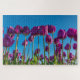 A fun and challenging jigsaw puzzle featuring bright purple tulips against a blue springtime sky