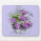 Purple tulip bouquet on old-fashioned lace doily with polka dot background.