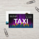 A creative design of building silhouettes with bright purple city lights shooting upwards to the sky. An embedded "TAXI" signage illuminates the skyline. Your prestigious name and job title rest at the top left corner. Directly across are all the contact details.