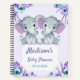 Customisable Baby Shower Hues Book with Cute Watercolor Two Babies Elephants/ Peanuts with Purple and Turquoise Bow and flowers.