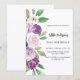 A violet, lavender watercolored background and an arch frame. Decorated with violet and purple watercolored flowers and greenery. Personalise and add your name and party details.