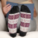 These pretty faux knit Holiday socks have a pattern of lavender retro style snowflakes in varying sizes. The snowflakes are placed on alternating dark violet and white wide stripes, with thin stripes separating the segments. Pretty for the Christmas season or all winter long! *Please note--the pattern is printed on the fabric, and not actually woven into it.