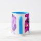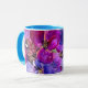 A white ringer mug with powder blue handle and rim, decorated with a handpainted watercolour and ink design of purple wallflowers.