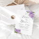 Elegant and rustic save the date card featuring an elegant script that says "save the date" featuring watercolor illustration of purple peony flowers with greenery.