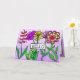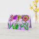 Hello, Thinking about You, hand drawn whimsical flowers, purple, pink, red and all fun bright colourful colours card for a friend or family member.