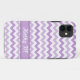 Stylish and girly chevron iPhone 5 case designed with a pattern of 2 shades of purple and white zigzags, and personalised with your name or custom text in white over purple.