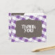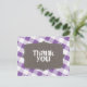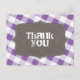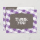 Southern country inspired rustic thank you postcards designed with "Thank you" in white over a brown frame canvas texture illustration, on a diagonal purple and white gingham pattern. The backside is personalised with your own custom message of thanks. You may also easily delete the template text to leave the card(s) blank for handwriting your own sentiments of gratitude. These cards, with their classic gingham pattern, are perfect for Baby Shower and Southern Bridal Shower celebrations.