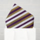 Holiday tissue paper with a diagonal stripe design of gold, white, and purple.