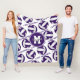 This volleyball themed fleece blanket features a mirrored pattern of volleyballs with purple and white panels and the sporty font text "I love volleyball" in purple that stretches between the angled rows of volleyballs - athlete name and monogram can be personalised on the large overlying circle pendant - background is customisable white - easily delete the "I love volleyball" text lines, if desired, or replace the monogram with the player's varsity letter or jersey number - by katz_d_zynes