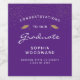 Celebrate your graduate's milestone in style with these custom graduation wine bottle labels, featuring the words "Congratulations to our Graduate" in white text on a purple background. The word "Graduate" appears in a graceful handwriting-style script. A pair of gold faux glitter mortar board caps and a scattering of gold confetti decorate the top portion of the label. Personalise it with your grad's name, school, and year of graduation.