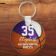 This custom basketball themed keychain for girls or boys features the realistic image of a basketball that has two recolored panels--one purple and one white - easily customise with player name & jersey number, plus school name and mascot name - by katz_d_zynes