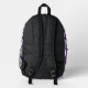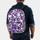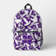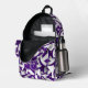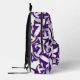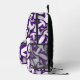 This fun volleyball backpack features a random pattern of varied size purple & white volleyballs turned every which way on a white background - customise with the athlete's name & jersey number - by katz_d_zynes