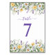Create your own purple, golden orange and white floral table cards for your wedding.