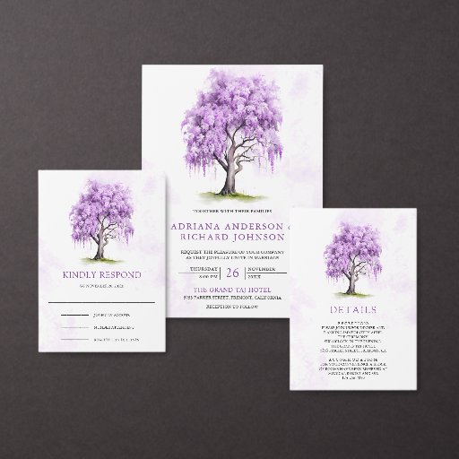 Amaze your guests with this elegant save the date featuring a beautiful wisteria tree with purple flowers. Simply add your event details on this easy-to-use template to make it a unique personalised one-of-a-kind save the date card.