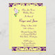 This wedding shower you card is decorated with a bride's bouquet superimposed on a lemon background and purple damask bar.