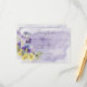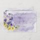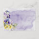 This simple but elegant reception card design features a bouquet of purple, yellow, and lavender pansies and other flowers with greenery. The background is a purple watercolor splash on a textured white watercolor paper background. It's part of the Purple & Yellow Floral Modern Wedding Suite created by Simply Farmhouse Press.