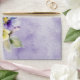 This simple but elegant design features a bouquet of purple, yellow, and lavender pansies and other flowers with greenery. The background is a purple watercolor splash on a textured white watercolor paper background. It's part of the Purple & Yellow Floral Modern Wedding Suite created by Simply Farmhouse Press.