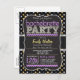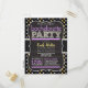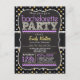 Bachelorette party invite with retro chalkboard look on black, dark grey, and yellow stars pattern with purple ric rac design elements and chalk look fonts invitation.