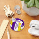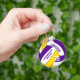 This purple, yellow and white boys' volleyball keychain with team name features a tricolor volleyball upon which you can customize the player's name and jersey number plus school team and mascot name - by katz_d_zynes