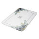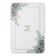 Design features a bouquet of eucalyptus greenery and beautiful hydrangeas with a lite grey border.