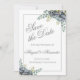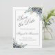 Design features a bouquet of purplish hydrangeas with a bouquet of eucalyptus greenery with a lite grey border. It goes with our matching wedding invitations collection.