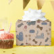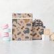 This whimsical design features cartoon cats in various poses, surrounded by paw prints, yarn balls, fish bones, cat toys, food bowls and bones on a light brown background. Ideal for kids, this wrapping paper brings a fun, pet-themed charm to any gift.