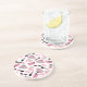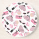 A coaster featuring a design consisting of pink and black retro cat eye sunglasses, pink change purses with grey polka dots, pink clutch purses with black bow, pink lipsticks, pink gemstones, and bottle of perfume with pink atomizer.