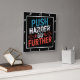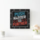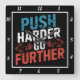 This black wall clock features the motivational text "PUSH HARDER GO FURTHER" stacked vertically in a bold, slightly distressed font with blue, white, and red colours. Graphic elements of a barbell and a dumbbell are integrated into the word "GO," visually reinforcing the workout theme. The design encourages increased effort and progress in fitness.