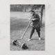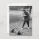 Woman in bloomers mowing lawn using push reel lawn mower. Probably 1910s or 1920s.