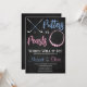 Cute putters and pearls gender reveal party invitations. A unique design featuring a blue golf bag and clubs with white pearls on a chalkboard background.