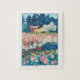 Depicted on this puzzle is an art quilt by Vicki L. Johnson titled Spring at the Farm. It shows an image of a farmhouse with flowers that was on the main road in Soquel, CA.