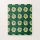 Crochet pattern of a daisy in dark and light yellow, with grey centre, on a hunter green background. Full flower in central 3x4 rows, outer rows show partial flowers.