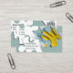 A puzzle house cleaning service business card has space for the introduction of house cleaning services provided. On the back find placeholders for a name, position, contact number, and social handles and a QR code to use an online messaging service. For assistance or to discuss a custom design, contact https://t.me/KBMD3signs_chat.