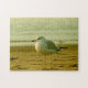 Seagull resting on one foot in the golden light of sunset. Background of gentle surf is blurred. Details of bird and close-up sand are clear.