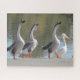 Brown geese with white stomach and necks have large basal knob on the upper side of the bill. All three are strutting along lakes edge with heads held high. In background is one white pelican and the calm waters of the lake.