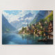 Puzzle with charming village lakeshore in Alps Mountains, fantasy illustration.