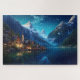Puzzle with charming village lakeshore in Alps Mountains, fantasy illustration.