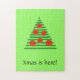 Christmas tree created with horizontal dark green lines. It is decorated with red ornaments. Text at bottom reads: "Xmas is here!" (may be personalised). Background is bright green.