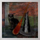 Pyewacket is a magical cat because his owner is a witch! Adorable black cat, witch's broom and hat in this Halloween scene! art by Cheryl Lawhon