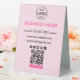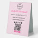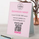 Modern Podestal sign for your business with your QR code for customers to scan for a list of your products, services and prices. Add your logo, business name, QR code, phone number and email address or social Media handle in simple Black & Pink typography.