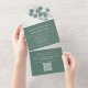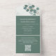 This design features a QR code elegant rsvp online all in one incitation with a classic eucalyptus green template, a guest response reply website web, reception on a budget simple, green greenery foliage leaves leaf, stylish trendy calligraphy script, classic traditional formal botanical, traditional classy modern minimal, guest details information info, a hand-drawn original artwork